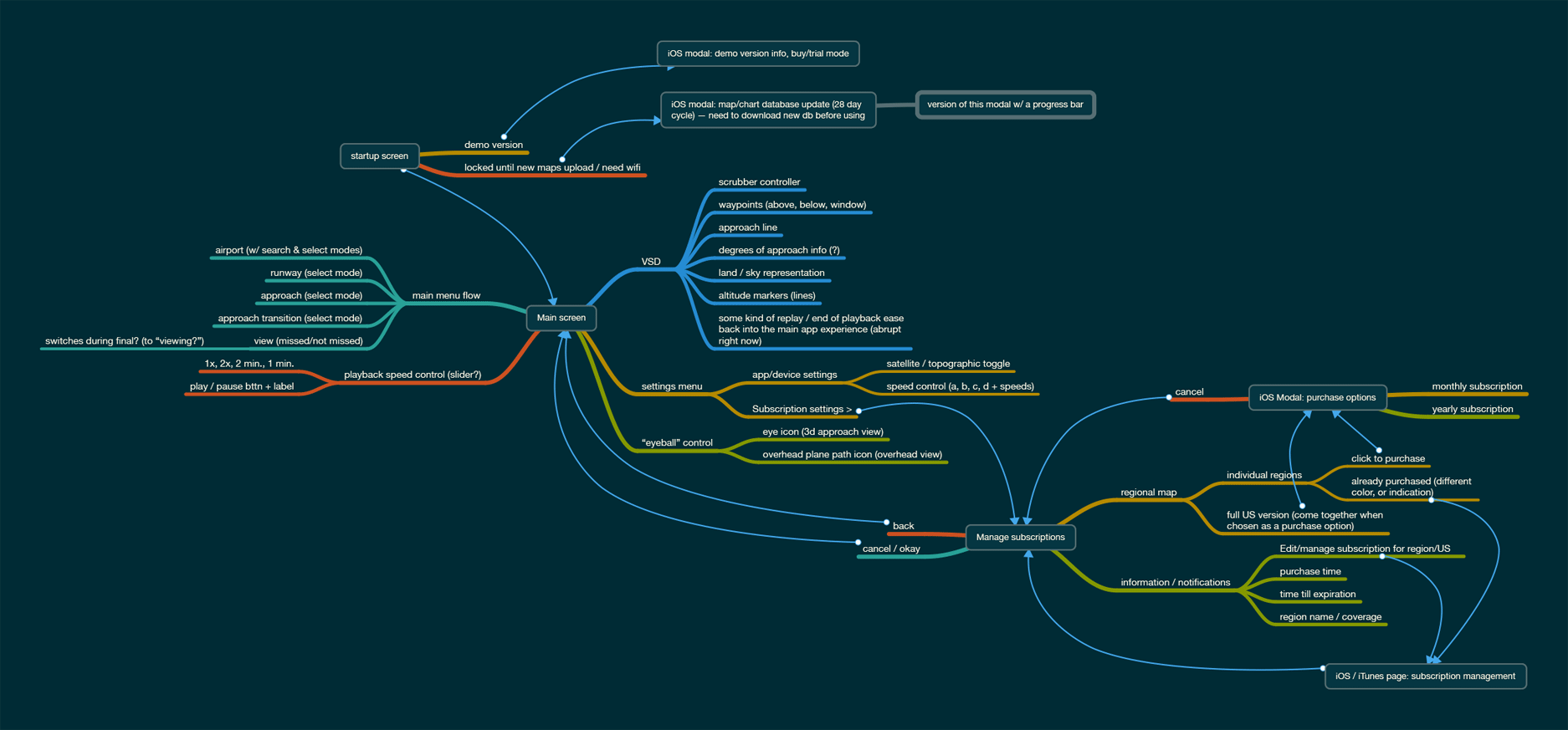 Here's where I come in. My role was to apply user-centered design principles to the existing tech. I worked with the team to create the iOS mobile app. I like to start with a mind mapping exercise (shown here to figure out flows and functions). From that mind map, we started getting into user flows of greater detail and fidelity.